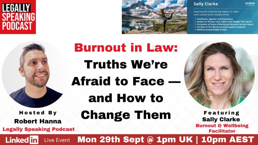 🚨 Lawyers aren’t burning out because they’re weak. They’re burning out because the system rewards depletion. Today on the Legally Speaking Podcast ™️ LinkedIn Live, I had the pleasure of sitting down with Sally Clarke, burnout and wellbeing expert, bestselling author, and ex-corporate finance lawyer who’s now helping others avoid the pain she lived through.